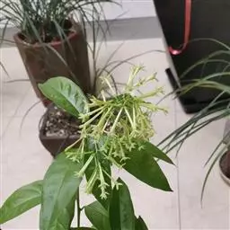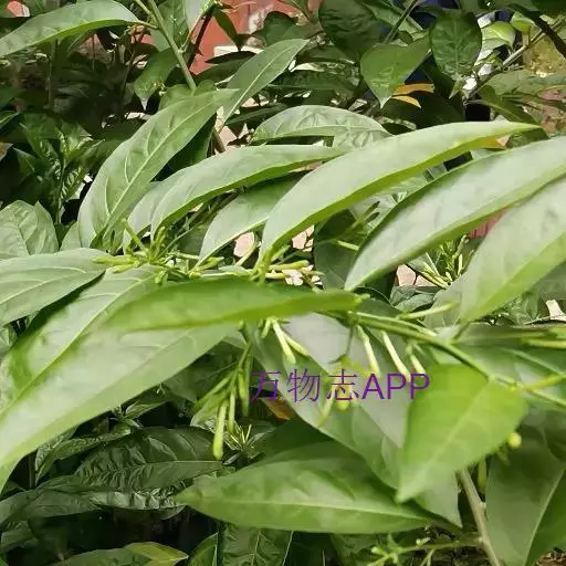形或矩圆状披针形,长6-15厘米,宽2-4.5厘米,全缘,顶端渐尖,基部近圆形或宽楔形,两面秃净而发亮,有6-7对侧脉。伞房式聚伞花序,腋生或顶生,疏散,长7-10厘米,有极多花;花绿白色至黄绿色,晚间极香。花萼钟状,长约3毫米,5浅裂,裂片长约为筒部的1/4;