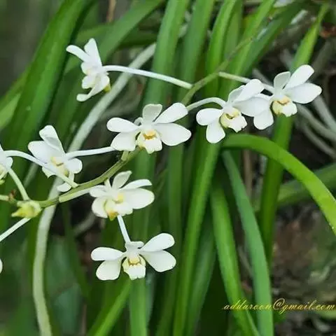 风兰 H.H.Hu):植株高8-10厘米。茎长1-4厘米,稍扁,被叶鞘所包。叶厚革质,狭长圆状镰刀形。…