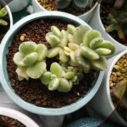 红缘莲花掌属蔷薇目、景天科植物,原产大西洋的加那利群岛。质厚,蓝绿色,被白霜,叶缘红褐色。聚伞花序,…