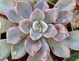 紫珍珠是景天科石莲花属的多年生肉质草本植物。植株中小型;叶片肉质,匙形,呈莲座状紧密排列;叶片粉紫色,…