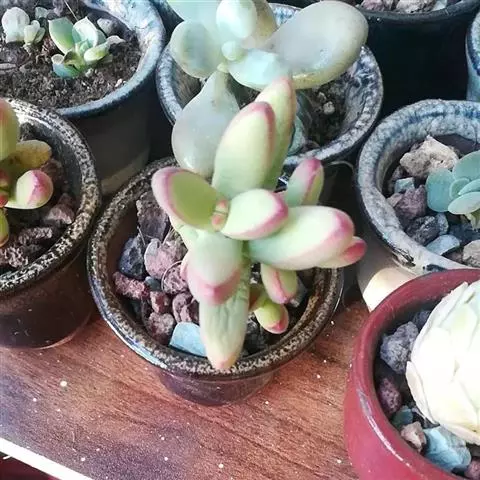 福娘为景天科银波锦属的肉质草本植物。对生的叶片呈短棒状,叶色灰绿,表覆白粉,叶缘外围镶着紫红色,…