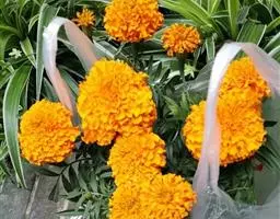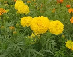 万寿菊是菊科万寿菊属一年生草本植物,别名孔雀菊、缎子花、臭菊花、西番菊、红黄草、小万寿菊、臭芙蓉、孔雀草。万寿菊茎近基部分枝。叶羽状分裂,长5-10厘米,宽4-8厘米,裂片长椭圆形或披针形,具锐齿,上部叶裂片齿端有长细芒,叶缘有少数腺体。头状花序单生,径5-8厘米,花序梗顶端棍棒状。总苞长1.8-2厘米,径1-1.5厘米,杯状,顶端具尖齿。舌状花黄或暗橙黄色,长2.9厘米,舌片倒卵形,长1.4厘米,基部成长爪,先端微弯缺。管状花花冠黄色,长约9毫米,冠檐5齿裂。瘦果线形,被微毛;冠毛有1-2长芒和2-3短而钝鳞片。花期7-9月。万寿菊中国各地均有栽培,在广东和云南南部、东南部已归化,国外原产墨西哥。万寿菊对土壤要求不严,但以肥沃疏松排水良好的土壤为好。耐移栽,种子发芽适温21-24℃,植株生长适合温度为20-29℃。喜温暖和阳光充足的环境,不