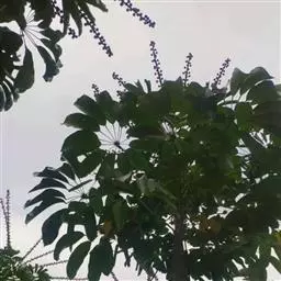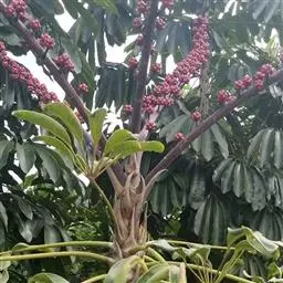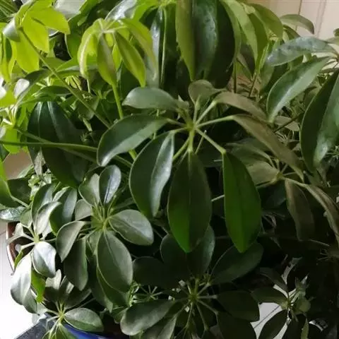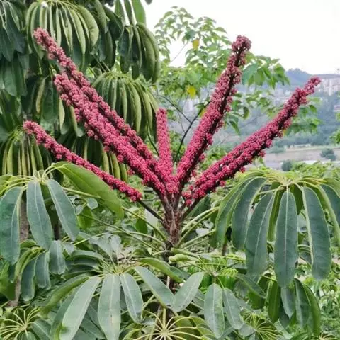 昆士兰伞木,吕松鹅掌柴 ,称昆石兰遮树,澳洲鸭脚木、方式叶鹅掌柴、伞树、大叶伞。叶片阔大,柔软下垂,形似伞状,株形优雅轻盈,易于管理,适于客厅的墙隅与沙发旁边置放,是室内理想的观叶植物。但目前多由南方引进,成本较高。常绿乔木,高可达30~40米。茎杆直立,少分枝,嫩枝绿色,后呈褐色,平滑。叶为掌状复叶,小叶数随树木的年龄而异,幼年时3~5片,长大时5~7片,至乔木状时可多达16片。小叶片椭圆形,先端钝,有短突尖,叶缘波状,革质,长20~30厘米,宽10厘米,浓绿色叶子。有光泽,叶背淡绿色。叶柄红褐色,长5~10厘米。浆果,圆球形,熟时紫红色。