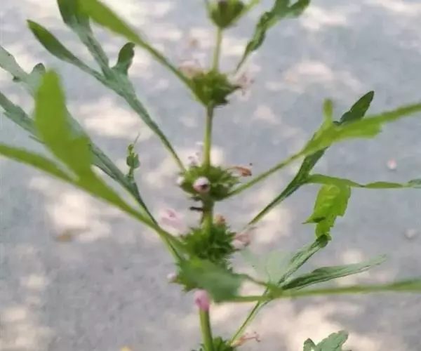 一年生或二年生草本,高60~100cm。茎直立,单一或有分枝,四棱形,被微毛。叶对生;叶形多种;叶柄长0.5~8cm。一年生植物基生叶具长柄,叶片略呈圆形,直径4~8cm,5~9浅裂,裂片具2~3钝齿,基部心形;茎中部叶有短柄,3全裂,裂片近披针形,中央裂片常再3裂,两侧裂片再1~2裂,最终片宽度通常在3mm以上,先端渐尖,边缘疏生锯齿或近全缘;最上部叶不分裂,,线形,近无柄,上面绿色,被糙伏毛,下面淡绿色,被疏柔毛及腺点。轮伞花序腋生,具花8~15朵;小苞片针刺状,无花梗;花萼钟形,外面贴生微柔毛,先端5齿裂,具刺尖,下方2齿比上方2齿长,宿存;花冠唇形,淡红色或紫红色,长9~12mm,外面被柔毛,上唇与下唇几等长,上唇长圆形,全缘,边缘具纤毛,下唇3裂,中央裂片较大,倒心形;雄蕊4,二强,着生在花冠内面近中部,花丝疏被鳞状毛,花花2室;雌蕊1,子房4裂,花柱丝状,略长于雄蕊,柱头2裂。小坚果褐色,三棱形,上端较宽而平截,基部楔形,长约2.5mm。花期6~9月,果期7~10月。