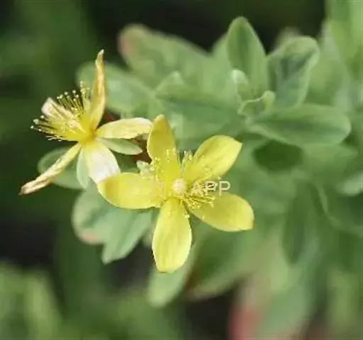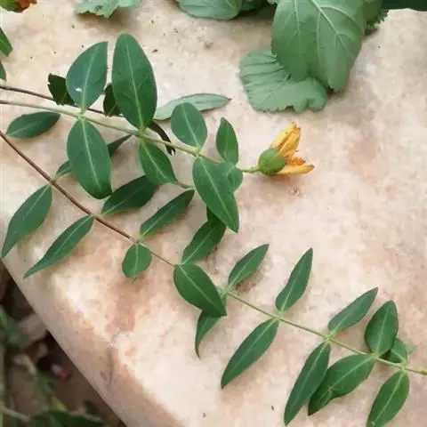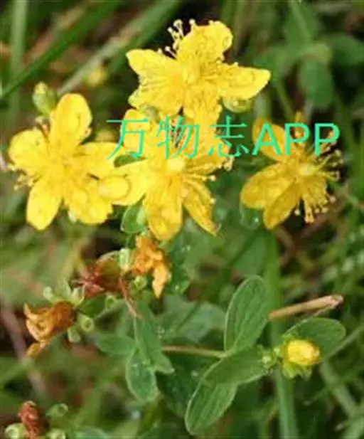 贯叶连翘 多年生草本,高20-60厘米,全体无毛。茎直立,多分枝,茎及分枝两侧各有1纵线棱。叶无柄,彼此靠近密集,椭圆形至线形,长1-2厘米,宽0.3-0.7厘米,先端钝形,基部近心形而抱茎,边缘全缘,背卷,坚纸质,上面绿色,下面白绿色,全面散布淡色但有时黑色腺点,侧脉每边约2条,自中脉基部1/3以下生出,斜升,至叶缘连结,与中脉两面明显,脉网稀疏,不明显。