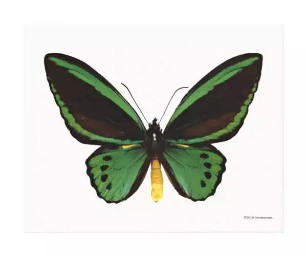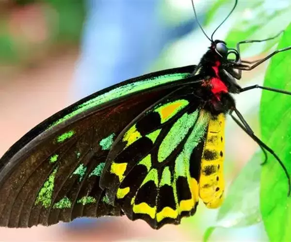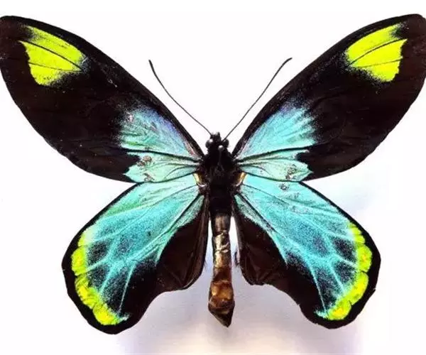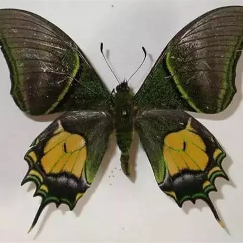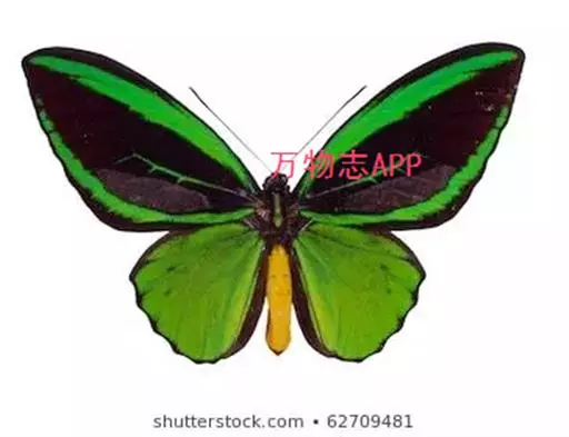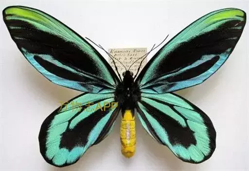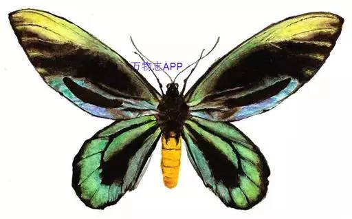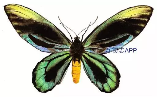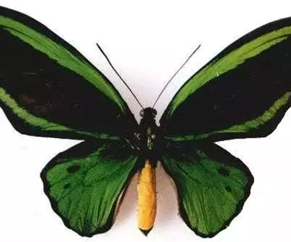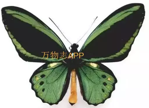 亚历山大鸟翼凤蝶(Ornithoptera alexandrae)雌蝶的翅展达280毫米,是世界上已知的最大的蝴蝶。雄蝶比雌 蝶小很多,但翅膀的花纹和颜色异常诱人。雄蝶后翅反面金黄色,布有黑脉纹,并具绿色色泽。喜在树顶飞翔。此 蝶不能用一般的捕虫网采集,当地土著人用弓箭射伤而捕获之。