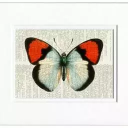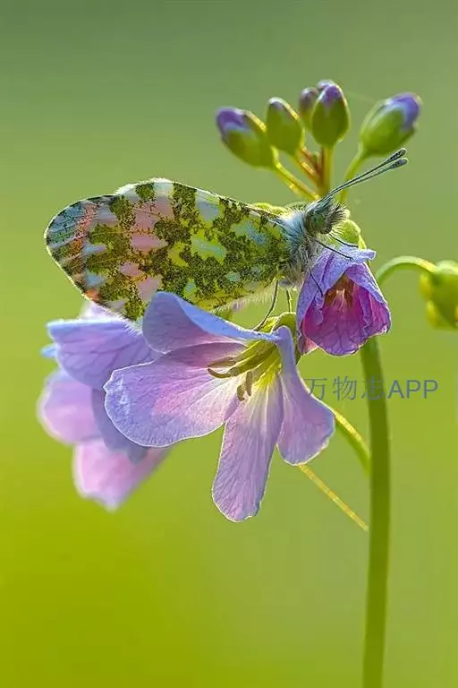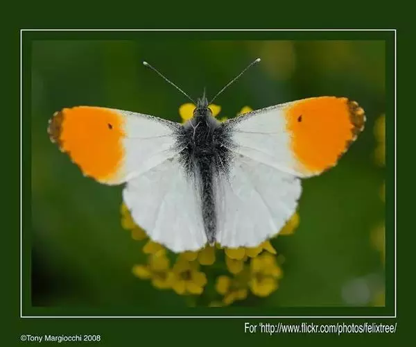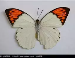 翅白色。前翅顶角及脉端黑色,中室端有1个肾状黑斑,雄蝶翅端部(中室端斑以外)橙红色,雌蝶全部白色;后翅反面有淡绿色云状斑,从正面可以透视。