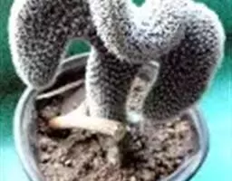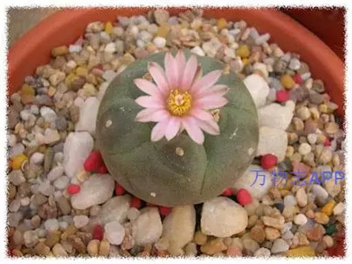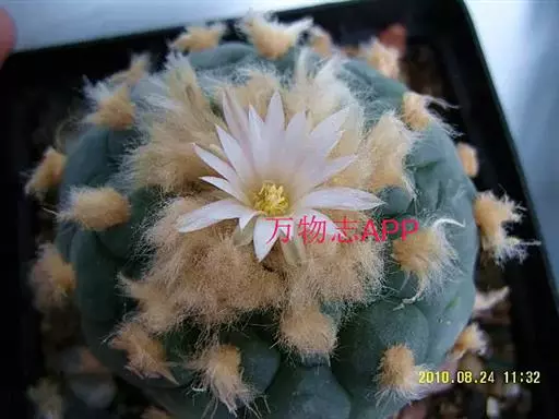 老植株易丛生,单株球体扁球形,顶部稍平,直径6~7cm。有肥大的直根长达10cm以上。棱分成瘤块状,瘤块低圆,灰绿色。刺座上无刺,有白色或黄白色软毛。植株肉较软。花着生在球体顶部,钟状或漏斗状,直径1.3cm,粉红色。果实棍棒状,长2cm,粉红色浆果。种子少,每果仅数粒至10余粒,黑色。本种为仙人掌类中著名的代表种之一,除观赏外还有一定的药用价值。栽培方便又无刺,是理想的家庭栽培种类。