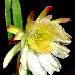 棱8—10,螺旋形排列但棱不是很明显,几乎没有棱沟。植株顶部多绒毛,灰白色。刺座圆形,很大,无刺只有绵毛。花小而短,开放短促,直径1.25厘米,淡红色。果实棍棒形,红色。