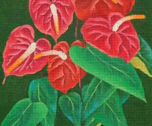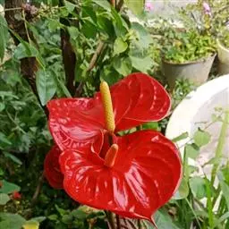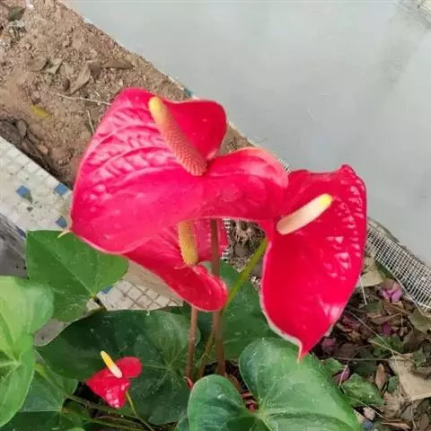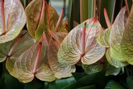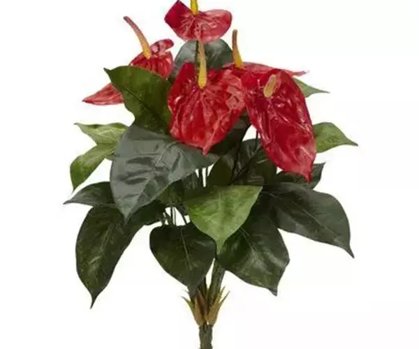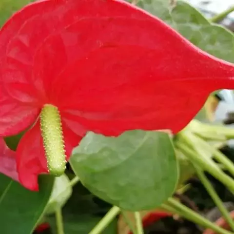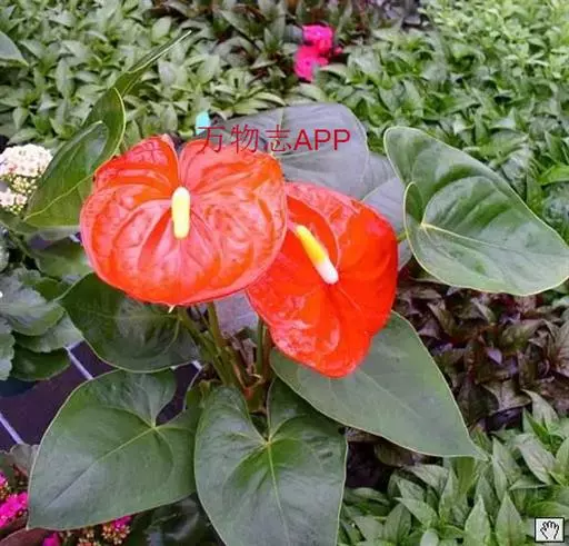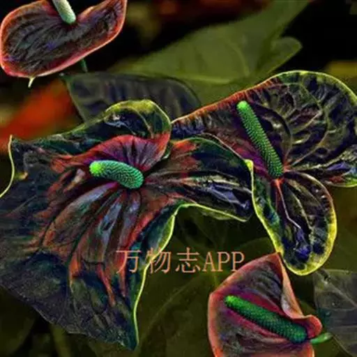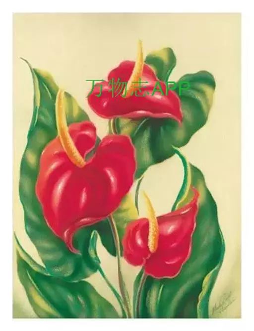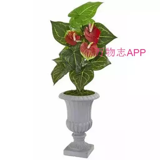 其株高一般为50~80cm,因品种而异。具肉质根,无茎,叶从根茎抽出,具长柄,单生、心形,鲜绿色,叶脉凹陷。花腋生,佛焰苞蜡质,正圆形至卵圆形,鲜红色、橙红肉色、白色,肉穗花序,圆柱状,直立。四季开花。