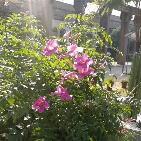 粉花凌霄 K.Schum.)是紫葳科魔盒凌霄属的落叶藤本植物。奇数羽状复叶对生,小叶全缘,…