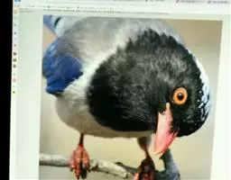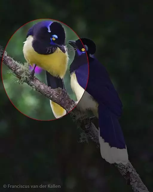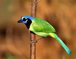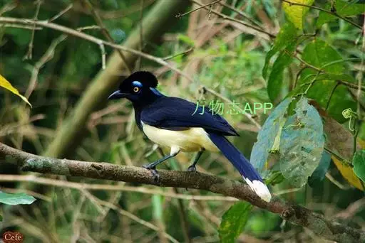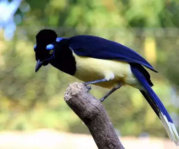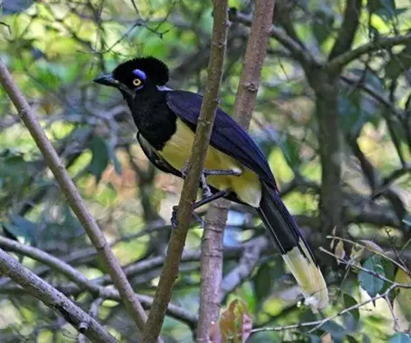 绒冠蓝鸦(学名:Cyanocorax chrysops):雌雄相似,体长35厘米,体重127-170克。具中等长度的鸟喙。平均体重约为157克,外形漂亮,脸部黑色,眼圈金色,眼圈四周有蓝色斑块,头上羽冠黑色如同黑色毡帽戴在头顶,非常醒目,喉部蓝色,下体胸部黑色,腹部黄色,背部蓝黑色,上部和翅上覆羽为暗紫色。尾巴相同,但尾羽终端具有很宽的白色或微黄色羽毛。鸟喙和腿黑色。虹膜柠檬黄或淡黄色。