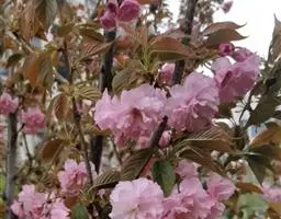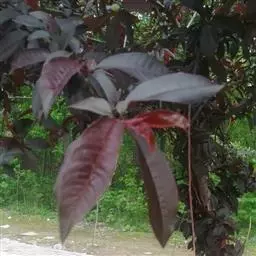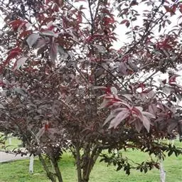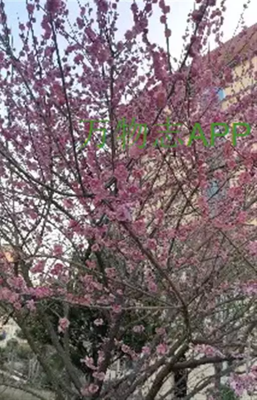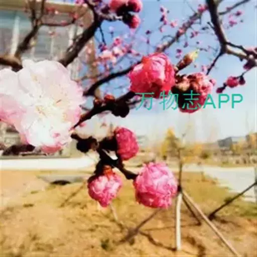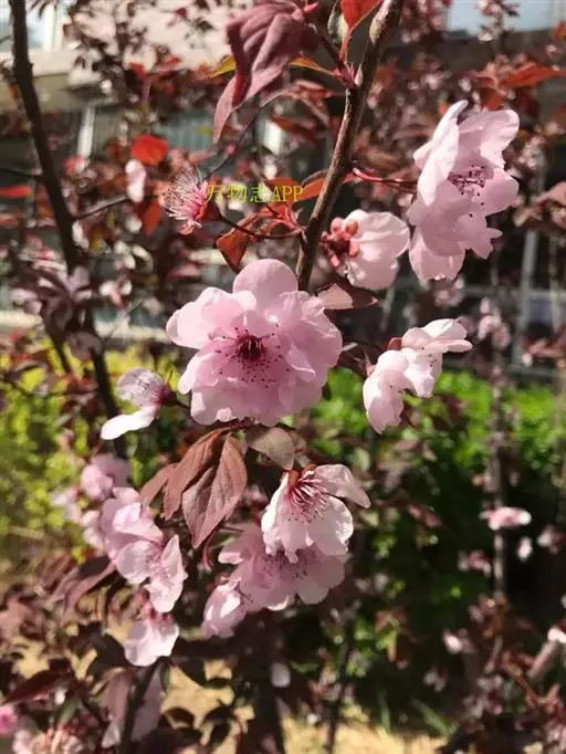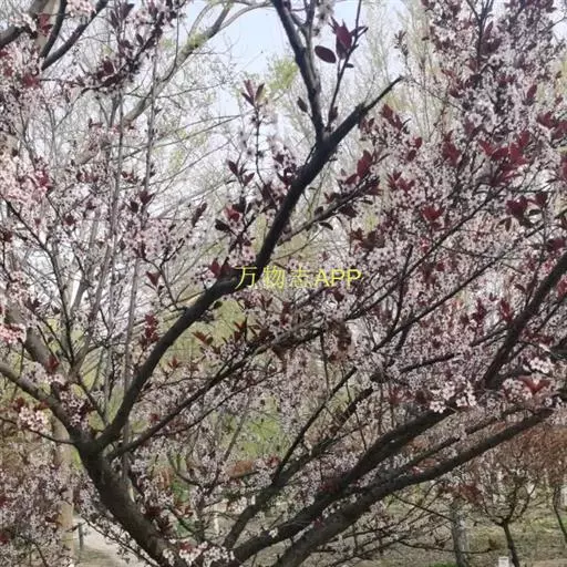 园艺杂交种,由重瓣粉型梅花与红叶李杂交而成。落叶小乔木。叶片卵圆形,长5-9厘米,紫红色,卵状椭圆形。花粉红色,着花繁密,1-2朵着生于长、中及短花枝上,先花后叶,花期春季,花叶同放,花色浅紫,重瓣花,先叶开放,萼筒宽钟状,萼片5枚,近圆形至扁圆,花瓣15-17枚,小瓣5-6梅,花梗1.5厘米,雄蕊多数,自然花期自3月18日第一朵花开以后,逐次自上而下陆续开放至4月中旬。