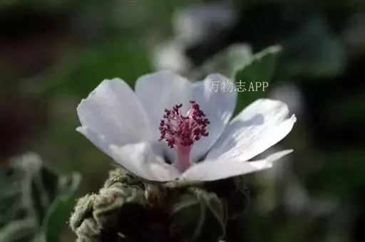 总苞的小苞片9枚,披针形,长4毫米,密被星状糙毛;萼杯状,5裂,裂片披针形,较苞片为长,密被星状糙毛,花冠直径约2.5厘米,淡红色,花瓣5枚,长约1.5厘米,倒卵状长圆形;雄蕊柱长8毫米。