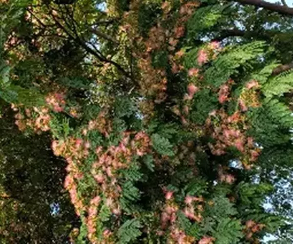 雨树(学名:Samanea saman (Jacq.) Merr.)是豆科雨树属植物,无刺大乔木;树冠极广展,干高10-25米,分枝甚低;总叶柄长15-40厘米,羽片及叶片间常有腺体。花玫瑰红色,组成单生或簇生、直径5-6厘米的头状花序,生于叶腋。果瓣厚,绿色,肉质,成熟时变成近木质,黑色;种子约25颗,埋于果瓤中。花期8-9月。