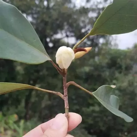 花蕾狭卵圆形,长约3厘米,佛焰苞状苞片密被红褐色平伏长柔毛,花梗长1.5-2.5厘米,具1-2苞片脱落痕;花被片纸质,约12片,有透明腺点,外轮3片倒卵状椭圆形,长2.5-4厘米,向内渐狭小;雄蕊长1.2-1.4厘米,花药长约8毫米,内向开裂,药隔伸出长约1毫米的尖头,雄蕊基部被灰黄色柔毛;雌蕊群狭卵形,长约1厘米,雌蕊群柄长约4毫米;雌蕊长约4毫米,心皮卵圆形,密被平伏微柔毛,花柱被灰黄色柔毛,约与子房等长。