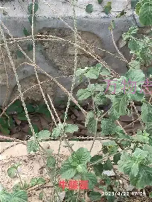 3、植物粗毛牛膝,别名土牛膝,多年生草本,高20~120厘米;根细长,直径3~5毫米,土黄色;茎四棱形,有柔毛,节部稍膨大,分枝对生。叶片纸质,宽卵状倒卵形或椭圆状矩圆形,长1.5~7厘米,宽0.4~4厘米,顶端圆钝,具突尖,基部楔形或圆形,全缘或波状缘,两面密生柔毛,或近无毛;叶柄长5~15毫米,密生柔毛或近无毛。穗状花序顶生,直立,长10~30厘米,花期后反折;总花梗具棱角,粗壮,坚硬,密生白色伏贴或开展柔毛;花长3~4毫米,疏生;苞片披针形,长3~4毫米,顶端长渐尖,小苞片刺状,长2.5~4.5毫米,坚硬,光亮,常带紫色,基部两侧各有1个薄膜质翅,长1.5~2毫米,全缘,全部贴生在刺部,但易于分离;花被片披针形,长3.5~5毫米,长渐尖,花后变硬且锐尖,具1脉;雄蕊长2.5~3.5毫米;退化雄蕊顶端截状或细圆齿状,有具分枝流苏状长缘毛。胞果卵形,长2.5~3毫米。种子卵形,不扁压,长约2毫米,棕色。花期6~8月,果期10月。