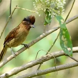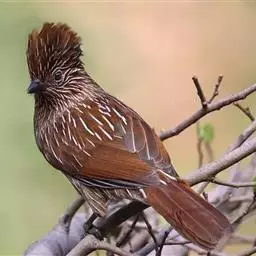 条纹噪鹛是画眉科、噪鹛属中型鸟类,体长28-32厘米。头具短的羽冠,上体栗褐色,飞羽外翻蓝灰色。…