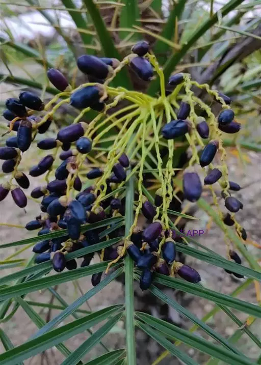 茎丛生,栽培时常为单生,高1-3米,稀更高,直径达10厘米,具宿存的三角状叶柄基部。叶长1-1.5(-2)米;羽片线形,较柔软,长20-30(-40)厘米,米,两面深绿色,背面沿叶脉被灰白色的糠秕状鳞秕,呈2列排列,下部羽片变成细长软刺。佛焰苞长30-50厘米,仅上部裂成2瓣;雄花序与佛焰苞近等长,雌花序短于佛焰苞;分枝花序长而纤细,长达20厘米;雄花花萼长约1毫米,顶端具三角状齿;花瓣3,针形,长约9毫米,顶端渐尖;雄蕊6;雌花近卵形,长约6毫米;花萼顶端具明显的短尖头。果实长圆形,长1.4-1.8厘米,直径6-8毫米,顶端具短尖头,成熟时枣红色,果肉薄而有枣味。花期4-5月,果期6-9月。 [1-2]