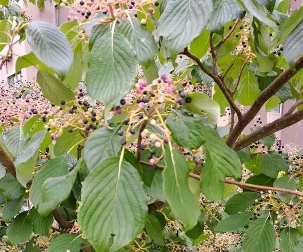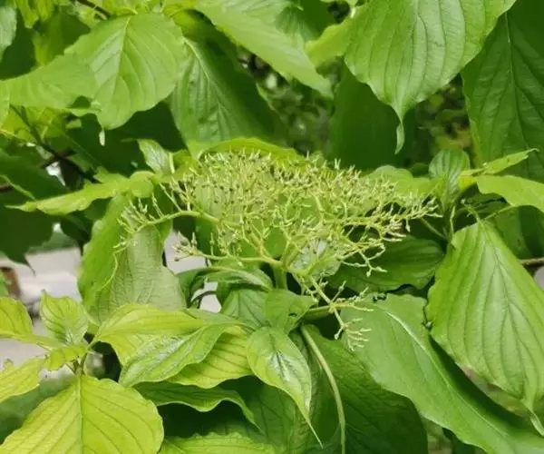 落叶乔木,高6-15米,稀达20米;树皮光滑,暗灰色或带黄灰色;枝开展,圆柱形,无毛或疏生短柔毛,当年生枝紫红绿色,二年生枝淡绿色,有半月形的叶痕和圆形皮孔。冬芽顶生或腋生,卵圆形或圆锥形,长3-8毫米,无毛。叶互生,纸质,阔卵形、阔椭圆状卵形或披针状椭圆形,长6-13厘米,宽3.5-9厘米,先端突尖,基部圆形或急尖,全缘,上面黄绿色,无毛,下面灰绿色,密被淡白色平贴短柔毛,中脉在上面微凹陷, 灯台树花 下面凸出,微带紫红色,无毛,侧脉6-7对,弓形内弯,在上面明显,下面凸出,无毛;叶柄紫红绿色,长2-6.5厘米,无毛,上面有浅沟,下面圆形。伞房状聚伞花序,顶生,宽7-13厘米,稀生浅褐色平贴短柔毛;总花梗淡黄绿色,长1.5-3厘米;花小,白色,直径8毫米,花萼裂片4,三角形,长约0.5毫米,长于花盘,外侧被短柔毛;花瓣4,长圆披针形,长4-4.5毫米,宽1-1.6毫米,先端钝尖,外侧疏生平贴短柔毛;雄蕊4,着生于花盘外侧,与花瓣互生,长4-5毫米,稍伸出花外,花丝线形,白色,无毛,长3-4毫米,花药椭圆形,淡黄色,长约1.8毫米,2室,丁字形着生;花盘垫状,无毛,厚约0.3毫米;花柱圆柱形,长2-3毫米,无毛,柱头小,头状,淡黄绿色;子房下位,花托椭圆形,长1.5毫米,直径1毫米,淡绿色,密被灰白色贴生短柔毛;花梗淡绿色,长3-6毫米,疏被贴生短柔毛。核果球形,直径6-7毫米,成熟时紫红色至蓝黑色;核骨质,球形,直径5-6毫米,略有8条肋纹,顶端有一个方形孔穴;果梗长约2.5-4.5毫米,无毛。花期5-6月;果期7-8月。
