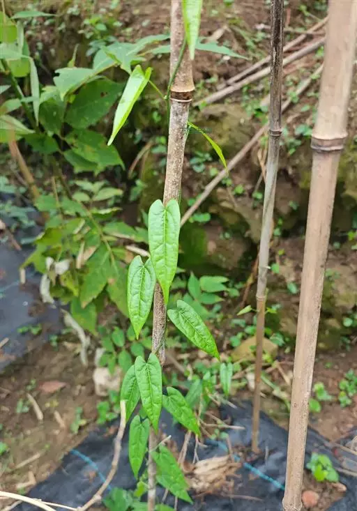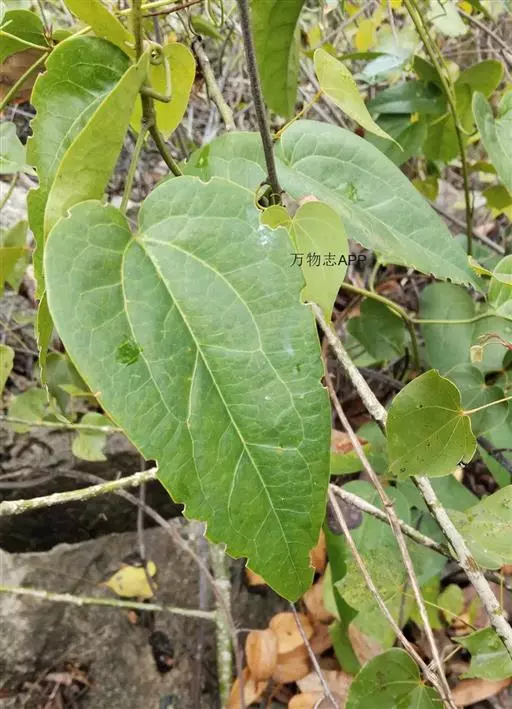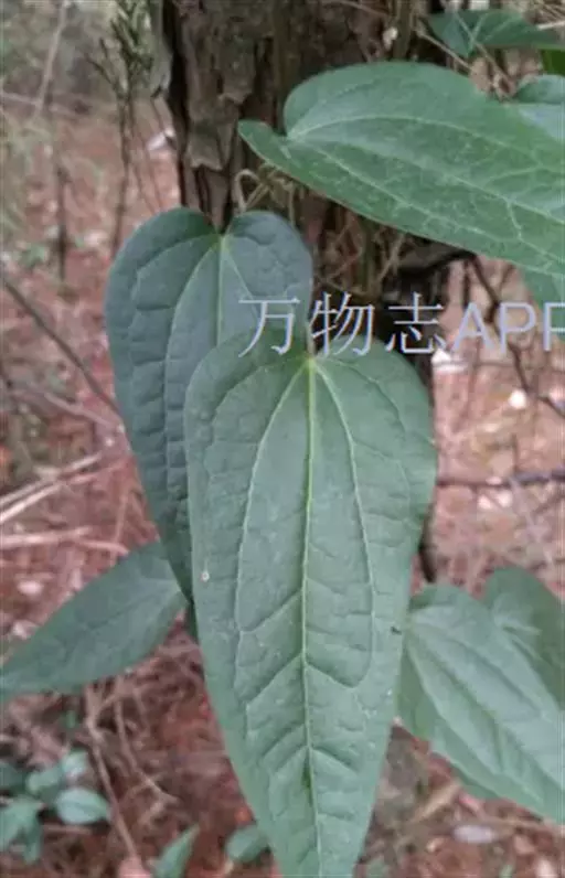 多年生 木质藤本。主根下部膨大成瘤状或地瓜状,粗1.5-2厘米,表面淡褐色,内部白色。单叶;叶片卵状披针形,长10-15厘米,宽3-7.5厘米,顶端渐尖,基部浅心形,边缘具刺头状的浅齿,两面无毛或背面仅叶脉上幼时被紧贴的绒毛,基出弧形中脉3-5-(-7)条,在表面平坦,在背面微隆起,侧脉网状在两面均能见;叶柄长2-6厘米,幼时被毛,后脱落。