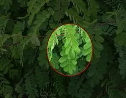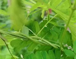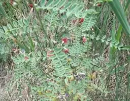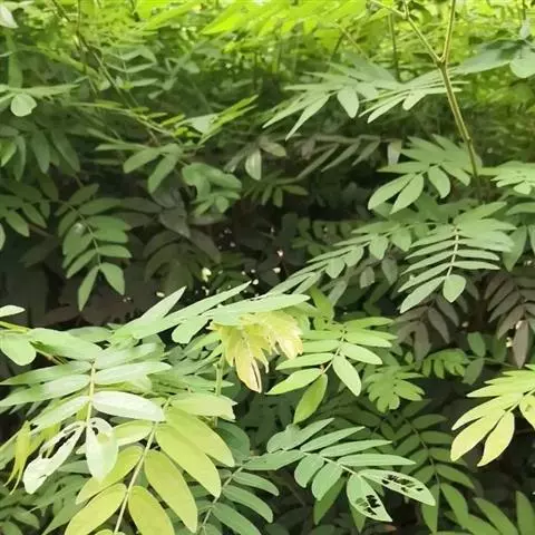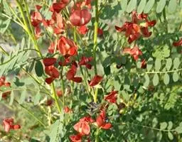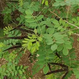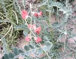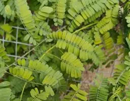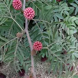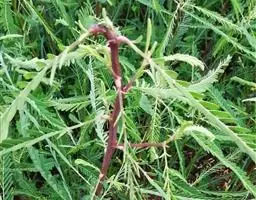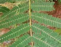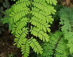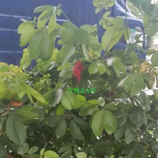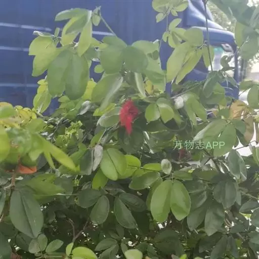 红粉扑花 半落叶灌木,高1-2米;枝条扩展,小枝圆柱形,褐色,粗糙。托叶卵状披针形,宿存。二回羽状复叶(互生),具有1对羽片,而其小叶只有1对,其形状如肾脏形。边缘被疏柔毛;中脉略偏上缘;小叶柄长仅1毫米。总叶柄长1-2.5厘米;羽片1对,长8-13厘米。