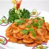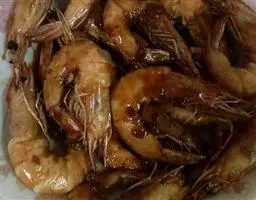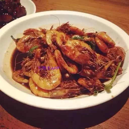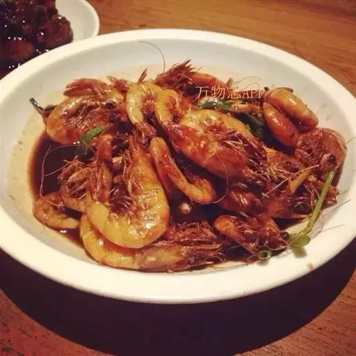 此菜酱红色,虾外脆内嫩,带着咸鲜味。