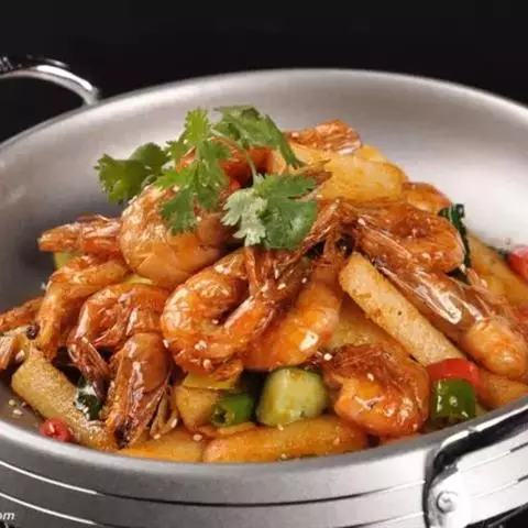 6. 爆香后倒入炸好的虾,迅速翻炒;