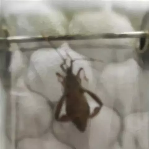 扁圆形,直径在20-25毫米。黄褐色,外包有一层较粗的粽色蛛丝,排列呈不规则状。内含卵在500-1000粒。卵粒呈圆球形、黄褐色。