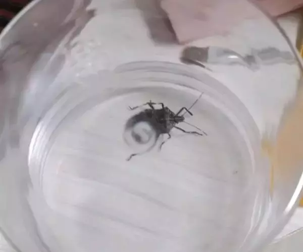 体长12-22毫米。体色与斑纹多变异,一般黑或黑褐色。背甲扁平,前端宽,中窝横向,颈沟明显。胸板中央有一“T”形黄斑,周缘呈黑褐色轮纹。腹部背面前端有肩突,心脏斑黄褐色,其两侧各有2个黑色筋点,呈梯形排列。腹背后部直至体末端有一棕黑色叶斑,边缘有黑色波纹,叶斑两侧为黄褐色。腹部腹面中央褐色,两侧各有一黑色条斑。纺器黑褐色。外雌器垂体呈黑色,弯曲部柔软,黄白色,有环纹,末部褐色,坚硬,边缘卷起。