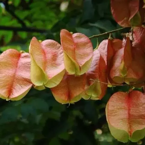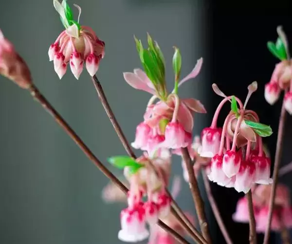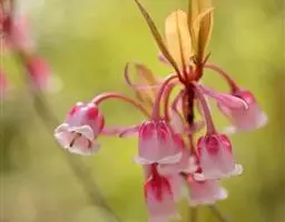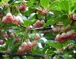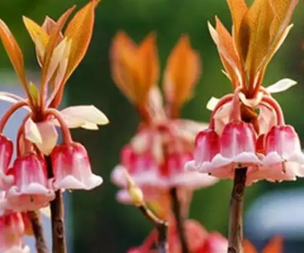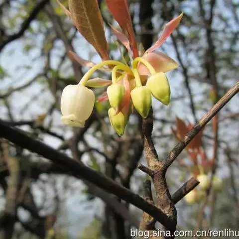 落叶灌木或小乔木,高2.6-6米。小枝光滑,无毛;芽鳞12-15}枚,宿存。叶密集枝顶,厚纸质,长圆形或长卵形,长6-8(-11)厘米,宽(2.8-)3.2-3.5(-4)厘米,先端短渐尖或渐尖,基部宽楔形或钝圆,边缘具细锯齿,不反卷,表面无毛,或中脉有微柔毛,背面中脉下部被白色柔毛,中脉、侧脉及网脉在两面明显,在背面隆起;叶柄较纤细,长6-12(-20)毫米,无毛。伞形花序顶生。每花序上有花2-6朵,花下垂;花梗长1-1.5 (-2)厘米,结果时直立,变粗壮,长可达3厘米;花萼绿色,萼片5,三角形;花冠钟形,白绿色,长约1厘米,口部5浅裂,裂片反卷;雄蕊10枚,花丝白色,长约5毫米,下部宽扁并具白色柔毛,花药具2反折的芒;子房圆柱形,5室,每室有胚珠10-15枚,花柱长约5毫米,无毛。蒴果椭圆形,长约1厘米,直径6-8毫米,干后黄褐色,无毛,具棱,顶端有宿存花柱,5裂,每室有种子数粒;种子瘦小,长约2毫米,具2膜质翅。花期4月,果期5-7月。