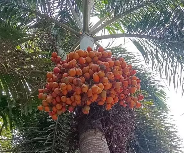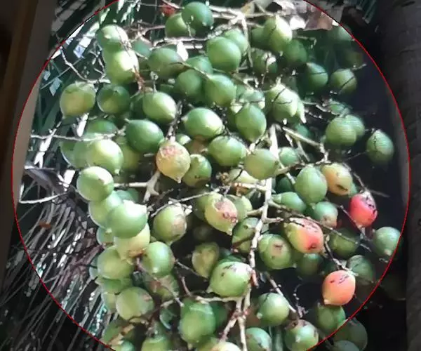 雌雄同株。粉红色穗状花序,分枝多,长于包茎底下。花单性,常3朵一组,中央为雌花,两侧为雄花,雄花有雄蕊60-71枚;雌花子房具3心皮、1室,具1胚珠。果椭圆形至卵圆形,长约6厘米,直径约3.5厘米,熟时橙红色。种子一枚,橄榄状椭圆形,表面有花纹,内果具有很多粗而硬的如浮雕般镶嵌在果核上的纤维,胚乳均匀,千粒重约20千克。