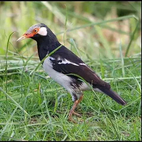 斑椋鸟:是中等体型的黑白色椋鸟,体长24厘米。头顶、头侧、翼斑、腰及腹部白色,喉、胸及上体余部黑色,…