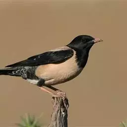 粉红椋鸟是雀形目椋鸟科粉红椋鸟属鸟类。头顶具紫色羽冠;头部、颈、颏、喉黑色具蓝紫色金属光泽;背和腹粉红色;两翅和尾黑褐色;虹膜暗褐色;嘴黄色或粉红色,上嘴基部黑色,冬季嘴为褐色;脚黄色。嘴较其他椋鸟短而钝,上嘴弯曲较明显;脚较粗壮,爪发达。粉红椋鸟分布于欧洲东南部、西伯利亚、西亚、印度和斯里兰卡岛等地区,在中国新疆西部和北部、西藏西部、澳门、台湾等地也能看到其身影。栖息于干旱平原、荒漠或半荒漠地区。常成群活动,鸣声嘈杂。主要在地面觅食,以甲虫、蝗虫、毛虫等各种昆虫为食,偶食植物果实和种子。繁殖期5—7月,营巢于岩壁缝隙、树洞中,每窝产卵4—6枚,卵白色或淡蓝色,孵化期13—15天。雏鸟晚成性,由雌雄亲鸟共同喂养。粉红椋鸟种群数量较少,已被列入中国国家林业局2000年8月1日发布的《国家保护的有益的或者有重要经济、科学研究价值的陆生野生动物名录》。