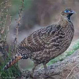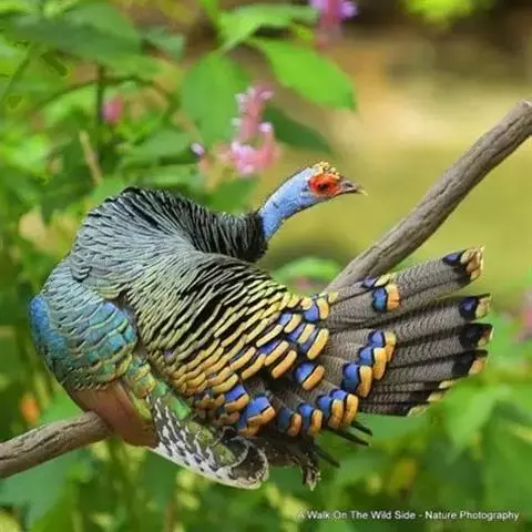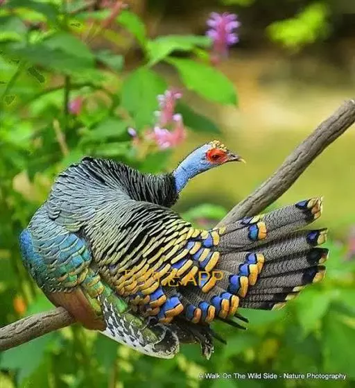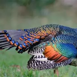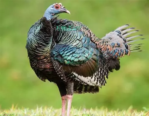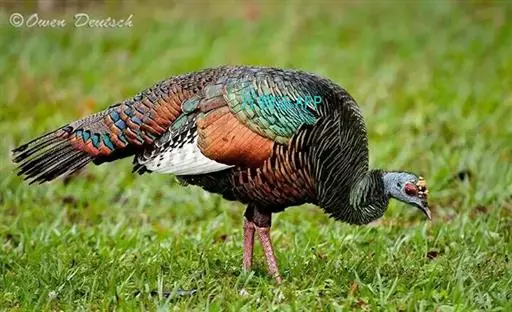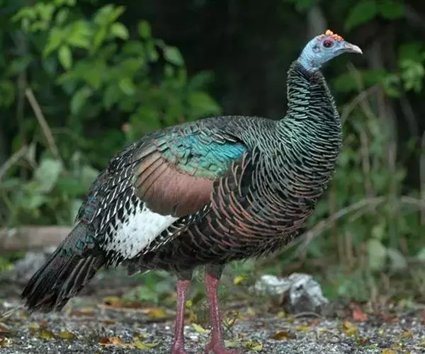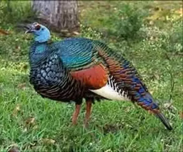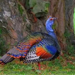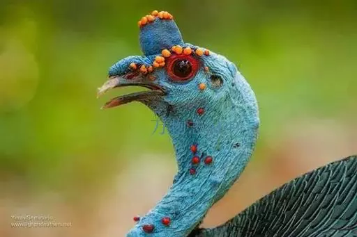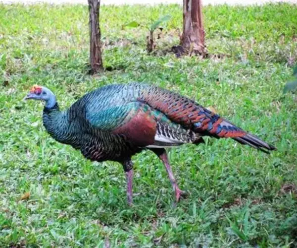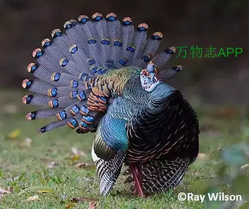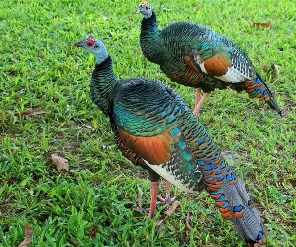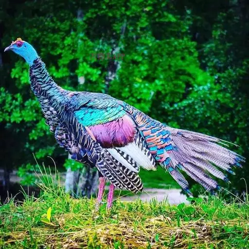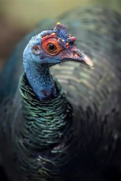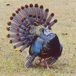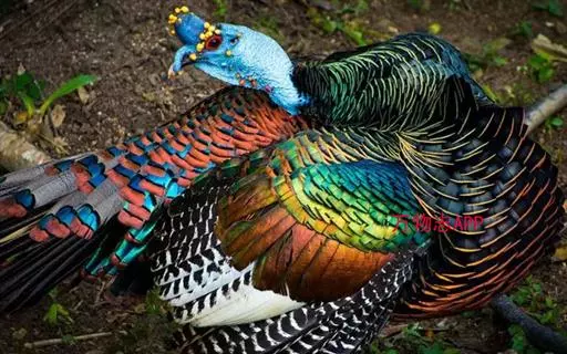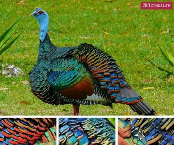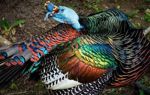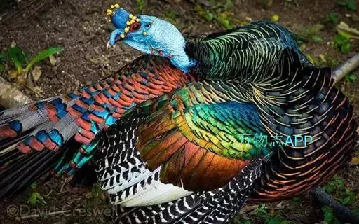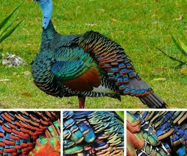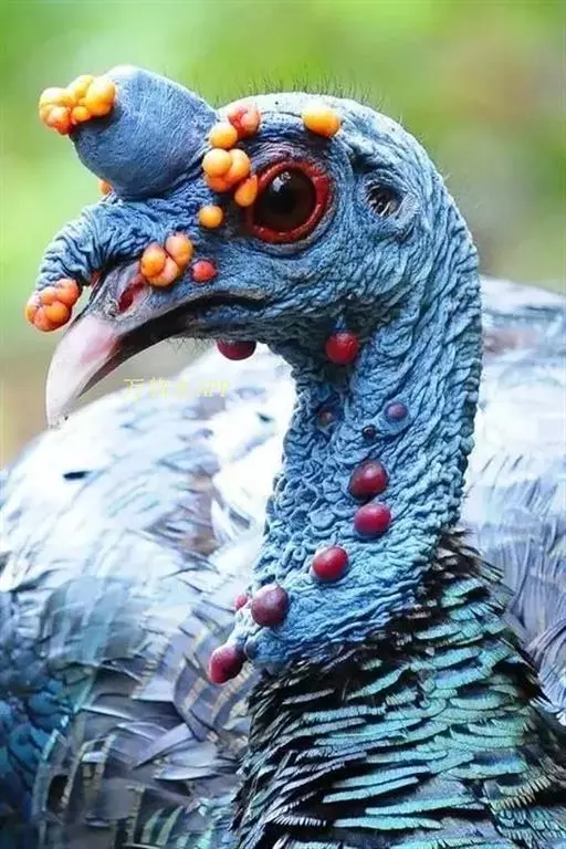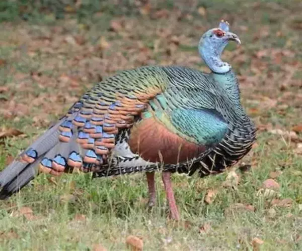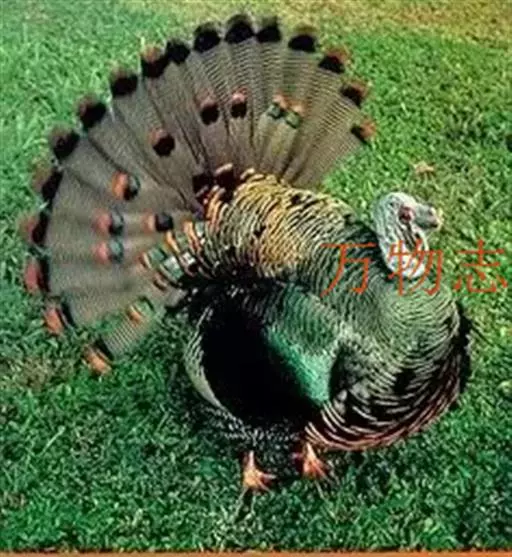 眼斑吐绶鸡(学名:Ocellated Turkey):是火鸡科的两种鸟类之一。体型比普通火鸡略小些,体长1米左右,体重2.4-5.4千克,雄性比雌性略大,长得很特别,蓝色的秃脑袋上冒出几个橙黄色的疙瘩。但是它羽色艳丽,身体呈铜色及绿色。虽然雌鸡较深及绿色,胸部羽毛与雄鸡相似。它们的尾部覆盖看一些眼状的斑点。眼斑吐绶鸡的名字就是这样来的。