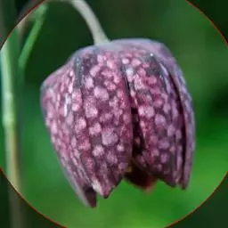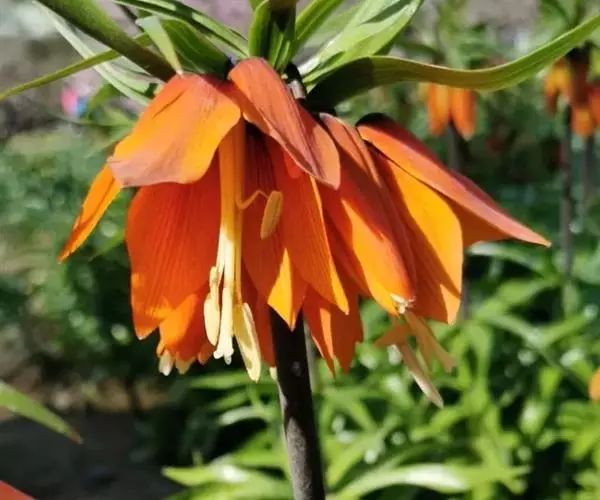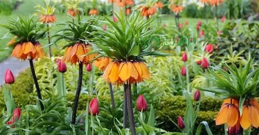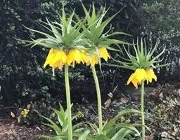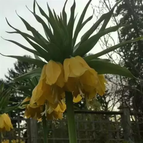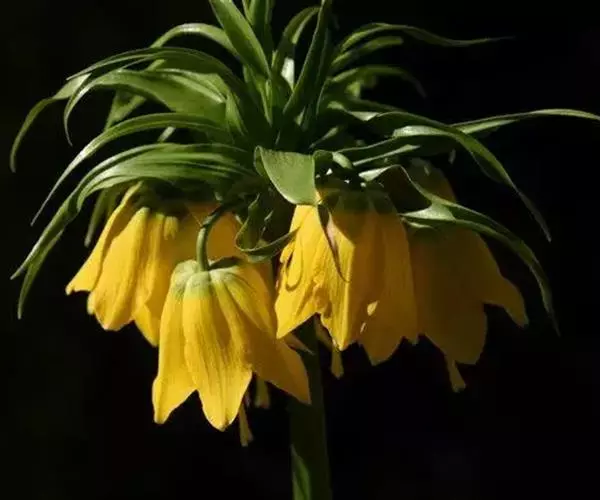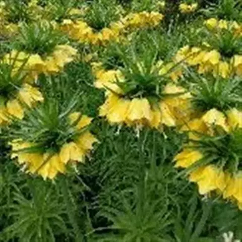 皇冠贝母为多年生直立粗壮草本植物,园艺栽培上属秋植球根。地下鳞茎由2-3片肥厚的肉质外鳞片组成,有臭味。通常开花鳞茎的周径需达到20-24厘米以上,大的种球能达30厘米以上,单球重120-150克左右。在外鳞片内,有数个由肉质鳞片包裹的花芽。初春鳞茎萌芽后,长出基生叶,基生叶轮状丛生,约40-50片。茎顶抽出花茎,高70-120厘米。花茎顶端,在顶生叶叶腋间着生小花。小花5-10朵,聚生于花茎顶部,形成-个顶生花盘,花盘冠幅直径可达25-30厘米,形态壮观。小花钟状下垂,花被内面基部有白色珍珠状蜜腺。花后结蒴果,三室,约有种子80粒左右。