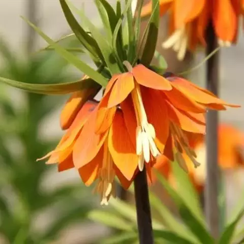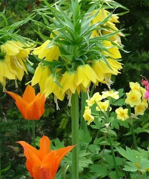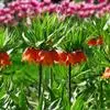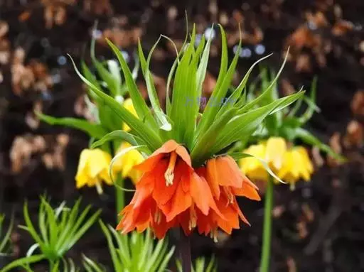 皇冠贝母(学名:Fritillaria imperialis L.)是百合科贝母属多年生直立粗壮草本植物,株高50-100厘米,地下具肥厚鳞茎,直径15-20厘米。叶片散生,披针形,长15厘米。花数朵轮生于花葶上端,于叶状苞片群下,花冠钟形,下垂,长约6厘米,花被片6,红色、橙色、黄色。花期4-5月。