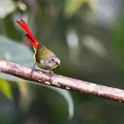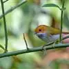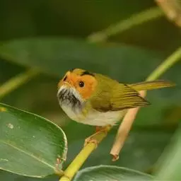 棕脸鹟莺:体长10厘米,是一种色彩亮丽而有特色的莺鸟。头栗色,具黑色侧冠纹。上体绿,腰黄色。下体白,…