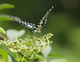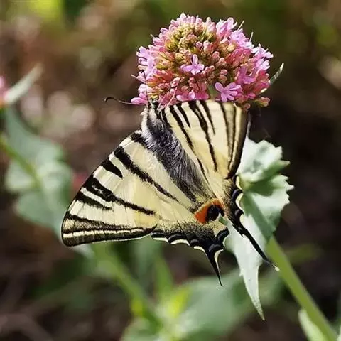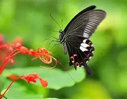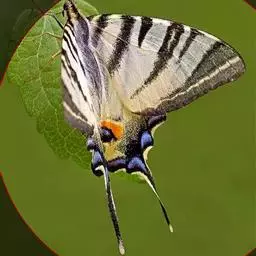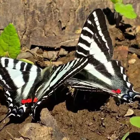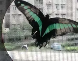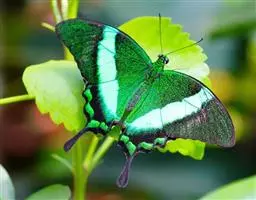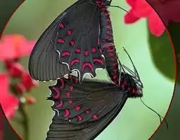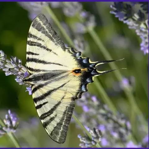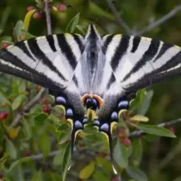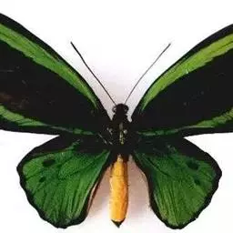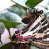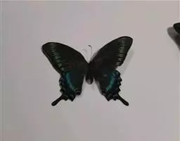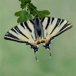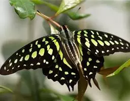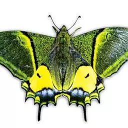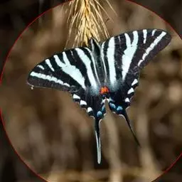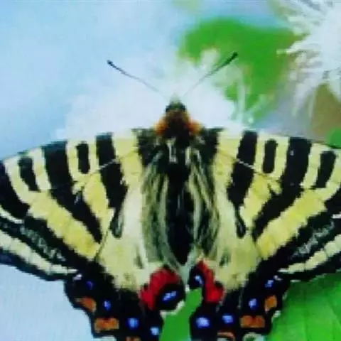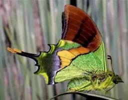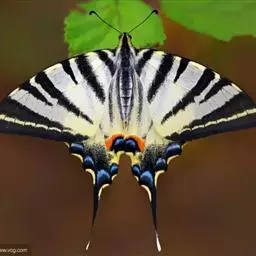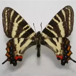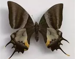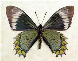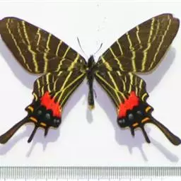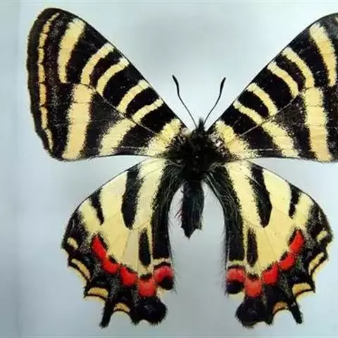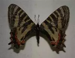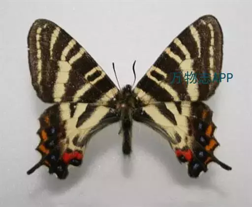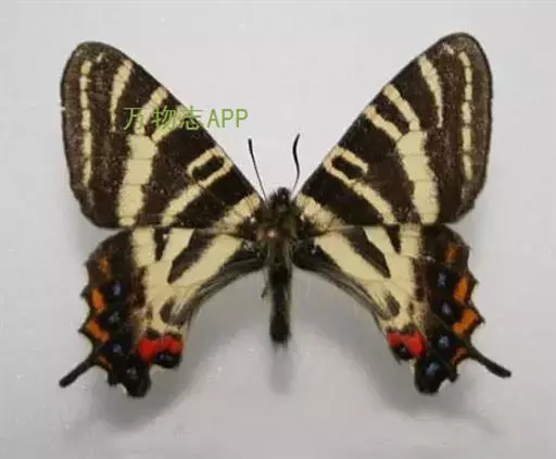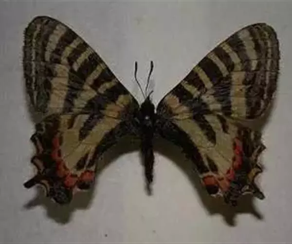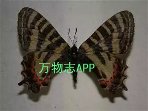 虎凤蝶模式种翼展为3.0-3.5厘米,翅面黄色,有黑色斑纹,翅脉黑色。底部是一个倒置的副本,颜色更为明亮。前翅外缘有宽的黑带,翅面有很多黑色短纹,犹如虎皮,故名。后翅黄色,有一长一短的黑色条纹,外缘波形,黑带上镶有四个弯月形黄斑,黑带的中间嵌有蓝色斑点,最里面一列弯月形红斑。在黄色衬底的前翅上,自前缘向后翅延射着八道如虎斑的粗黑条纹,后翅外缘呈锯齿状。雌蝶比雄蝶略暗。