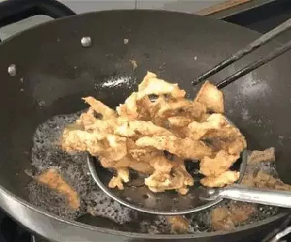 4.炒锅烧热放入猪油和植物油,放入五花肉片煸至焦香,盛出;