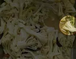 4、再加入秀珍菇和蘑菇炒至磨菇变熟,加适量鸡粉调味;