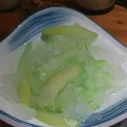 2.入开水锅中焯水一分钟左右,捞出立即用冷水冲淋至完全凉透,沥水备用;
