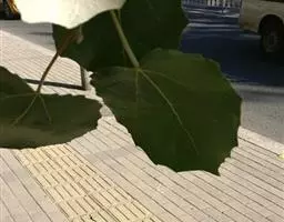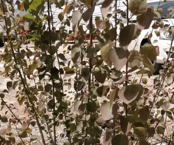 叶三角状卵圆形或近圆形,长宽近等,长3-6厘米,先端钝尖、急尖或短渐尖,基部圆形、截形或浅心形,边缘有密波状浅齿,发叶时显红色,萌枝叶大,三角状卵圆形,下面被柔毛;叶柄侧扁,长2-6厘米。