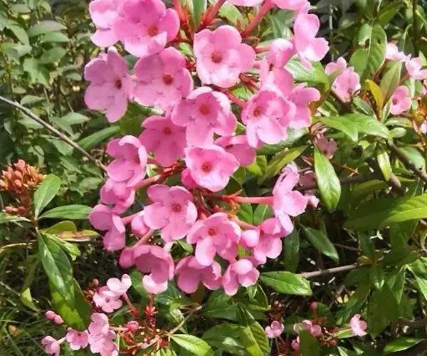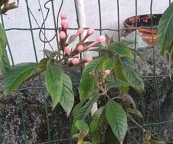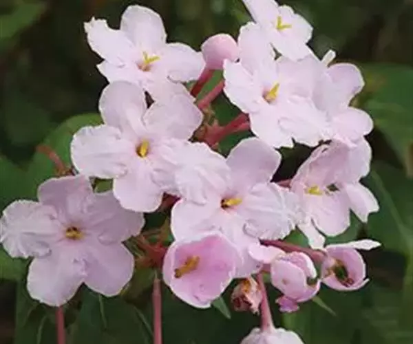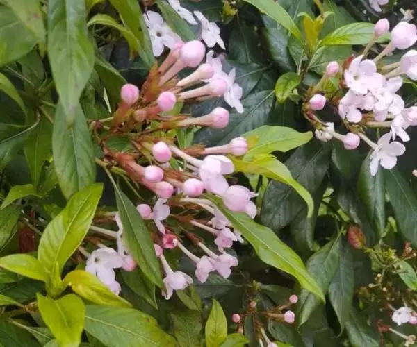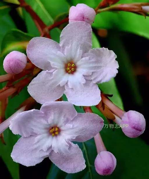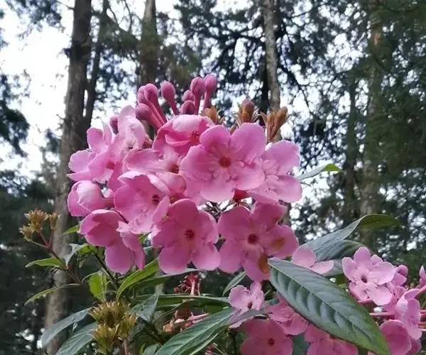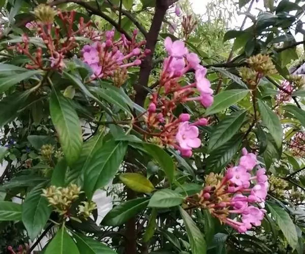 滇丁香(原变种),灌木或乔木,高2-10米,多分枝;小枝近圆柱形,有明显的皮孔。叶纸 滇丁香花叶 质,长圆形、长圆状披针形或广椭圆形,长5-22厘米,宽2-8厘米,顶端短渐尖或尾状渐尖,基部楔形或渐狭,全缘,上面无毛,下面常较苍白,无毛或被柔毛,或仅沿脉上被柔毛,常在脉腋内有簇毛;中脉在上面平坦,在下面凸起,侧脉9-14对,与中脉成45度角伸出,在上面平坦,在下面稍凸起;叶柄长1-3.5厘米,无毛或被柔毛;托叶三角形,长约1厘米;顶端长尖,无毛,脱落。伞房状的聚伞花序顶生,多花;苞片叶状,线状披针形,长1.5厘米,无毛,脱落;总花梗无毛;花美丽,芳香;花梗长约5毫米,无毛;萼管无毛或有秕糠状疏毛或疏柔毛,萼裂片近叶状,披针形,顶端尖,长0.8-1.8厘米,宽2-6毫米,常有缘毛,外面有时有疏柔毛;花冠红色,少为白色,高脚碟状,冠管细圆柱形,长2-6厘米,宽约4毫米,花冠裂片近圆形,长1.5-2.2厘米,顶部宽约1.5厘米,在每一裂片间的内面基部有2个片状附属物;雄蕊着生在冠管喉部,花丝长约2毫米,花药线状长圆形,长4.5-5.5毫米,内藏或稍伸出;柱头与花柱相似,顶端2裂,内藏或稍伸出,子房2室,胚珠多数。蒴果近圆筒形或倒卵状长圆形,有棱,无毛或有疏短柔毛,长1.5-2.5厘米,直径0.5-1厘米;种子多数,近椭圆形,两端具翅,连翅长约4毫米。