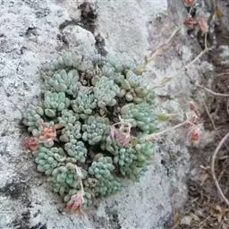 叶子表面宽厚,富肉质感且带有磨纱质感,看像石头质地;开红色小花,生于植株顶部,倒伞形密生,形状像花…