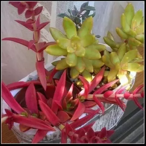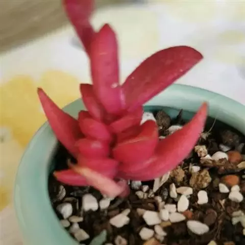 红稚儿Crassula pubescens subsp. radicans Toelken为景天科、青锁龙属多肉植物。植株丛生,有细小的分枝,茎肉质,时间养久了茎会逐渐半木质化,红稚儿叶片有点薄,叶片颜色绿。颜色反差巨大,平时为绿色,日照充足的春秋季节,变为火红色。野外分布于南非东开普省布什维德谷。喜温暖干燥和阳光充足的环境,怕低温和霜雪,耐半阴。叶形叶色较美,有一定的观赏价值;盆栽可放置于电视、电脑旁,可吸收辐射,亦可栽植于室内以吸收甲醛等物质,净化空气。