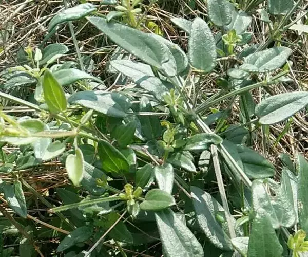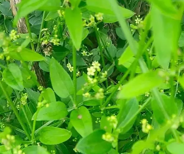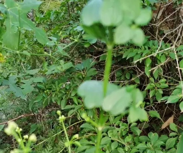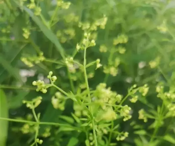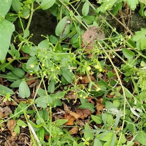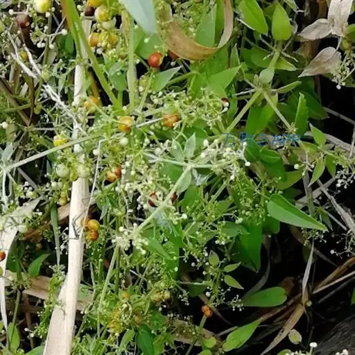 茜草(学名:Rubia cordifolia L.):茜草科,茜草属多年生草质攀援藤木,长通常可达3.5米;根状茎和其节上的须根均红色;茎多条,细长,方柱形,棱上生倒生皮刺,叶片轮生,纸质,披针形或长圆状披针形,顶端渐尖,心形,边缘有齿状皮刺,两面粗糙,叶柄长可达2.5厘米,聚伞花序腋生和顶生,,有花数十朵,花序和分枝均细瘦,花冠淡黄色,花冠裂片近卵形,果球形,橘黄色。8-9月开花,10-11月结果。