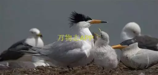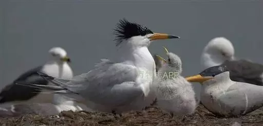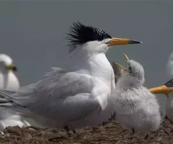 在闽江口湿地沙滩上交配,4月始,刚刚到达中国闽江口的中华凤头燕鸥开始了叼食求偶行为,为繁殖后代做准备。混群在数千只大凤头燕鸥中繁殖。中华凤头燕鸥的繁殖时间为5-8月,中华凤头燕鸥和大凤头燕鸥混群产卵,繁殖时间也基本同步;通常营巢于海边有稀疏矮小植物的沙地或沙酥地上。巢甚简陋。主要由亲鸟在沙石地上刨一浅坑,内无任何内垫物。一对中华凤头燕鸥一年只产1枚卵,由父母轮流孵化和共同饲育;它们以海洋上层小鱼为食,与海洋生态系统健康与否密切相关,是海洋生态系统的旗舰物种。刚出壳的中华凤头燕鸥雏鸟,全身毛绒绒的,洁白的羽毛布满黑褐色的斑点。它们一般会在巢里呆上几天后,才能四处走动。亲鸟们都忙着外出捕鱼了,雏鸟们聚在一起等着父母回来。一只中华凤头燕鸥留了下来,负责看护这些小家伙们。到了8月底,这些马祖列岛出生的中华凤头燕鸥幼鸟的羽毛逐渐丰满,嘴尖也有了些许黑色,与它的父母越来越像了。