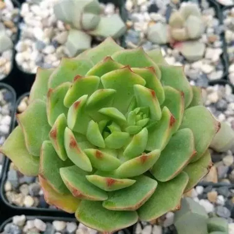 花乃井是景天科拟石莲花属的多肉植物,原产于墨西哥。株型小巧,叶片饱满,在阳光充足、温差大的环境下叶…