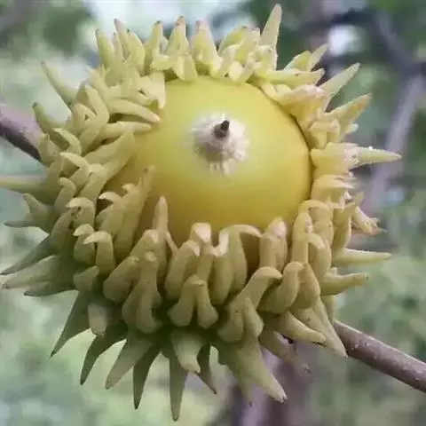 坚果卵形、长卵形或椭圆形,直径0.9-1.4厘米,高1-1.6厘米,无毛或被薄毛,果脐平坦或微凸起。花期4-5月,果期10月。